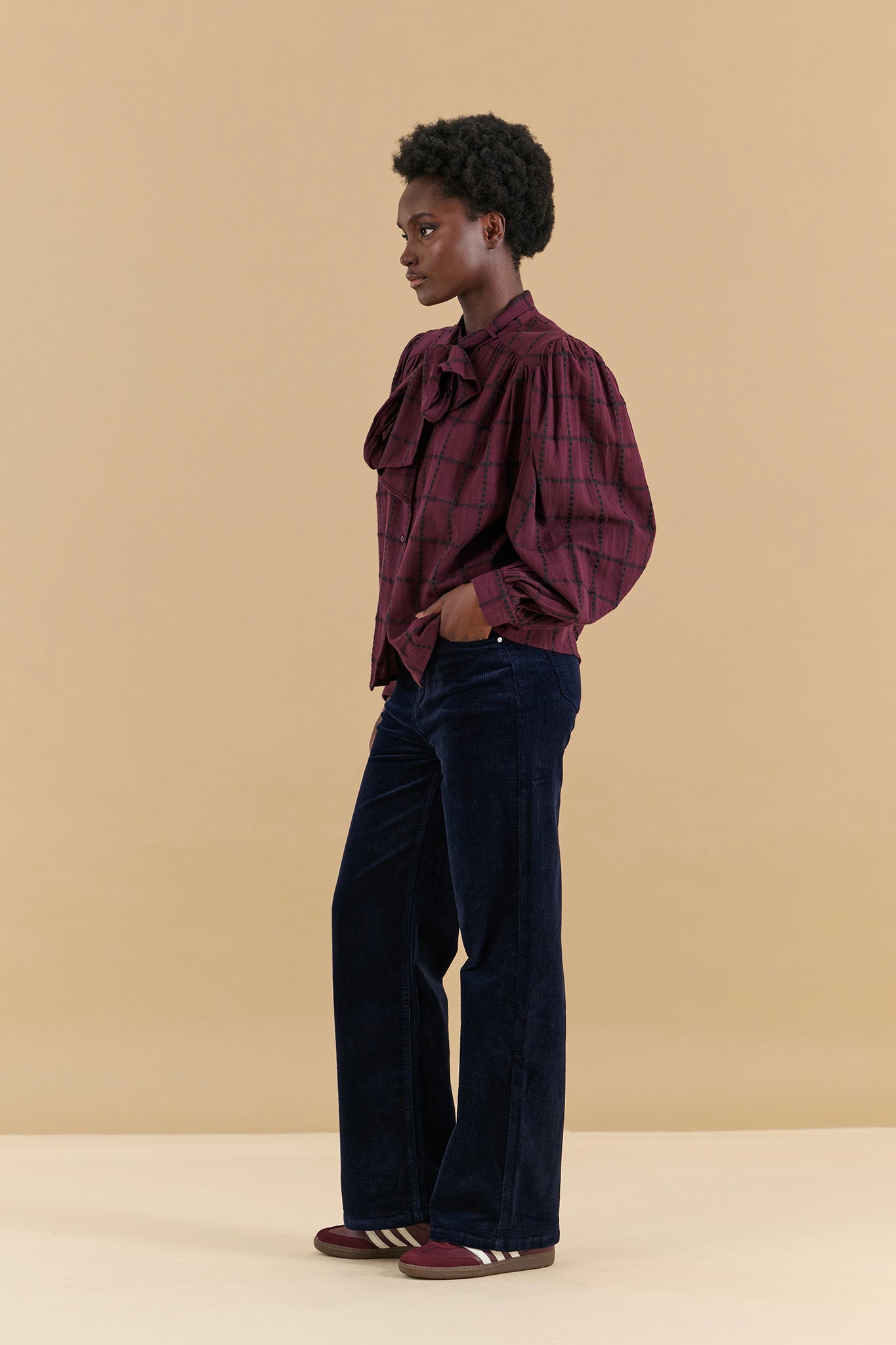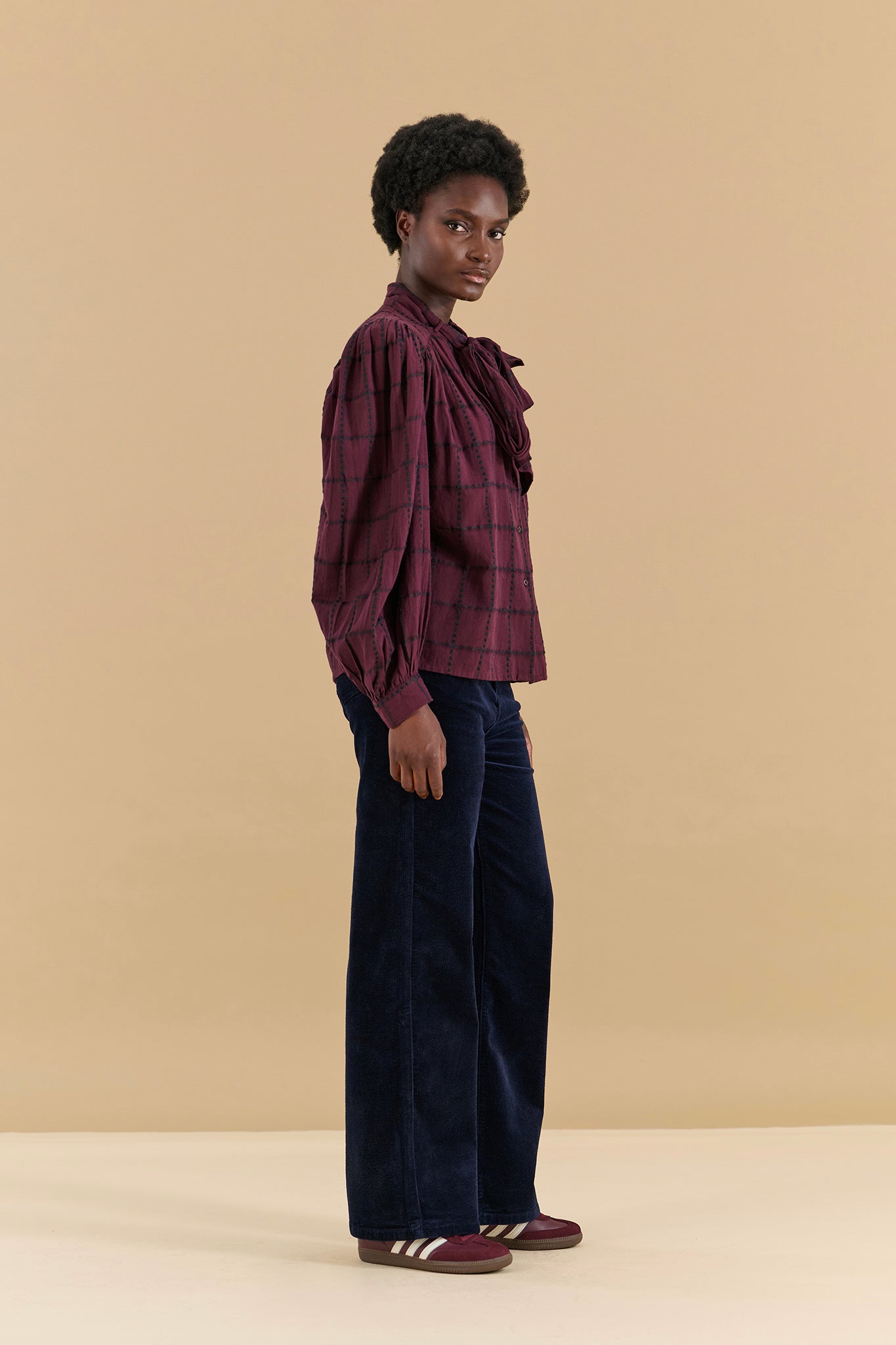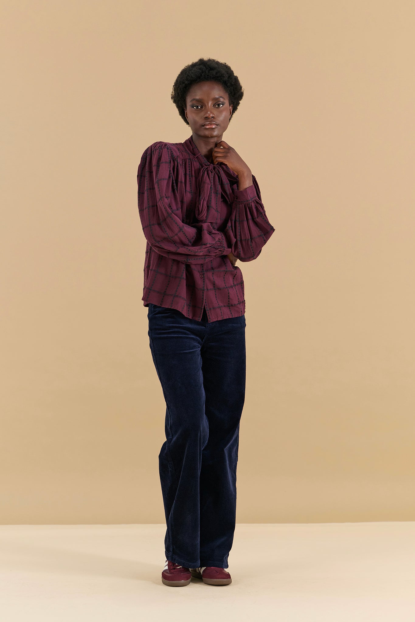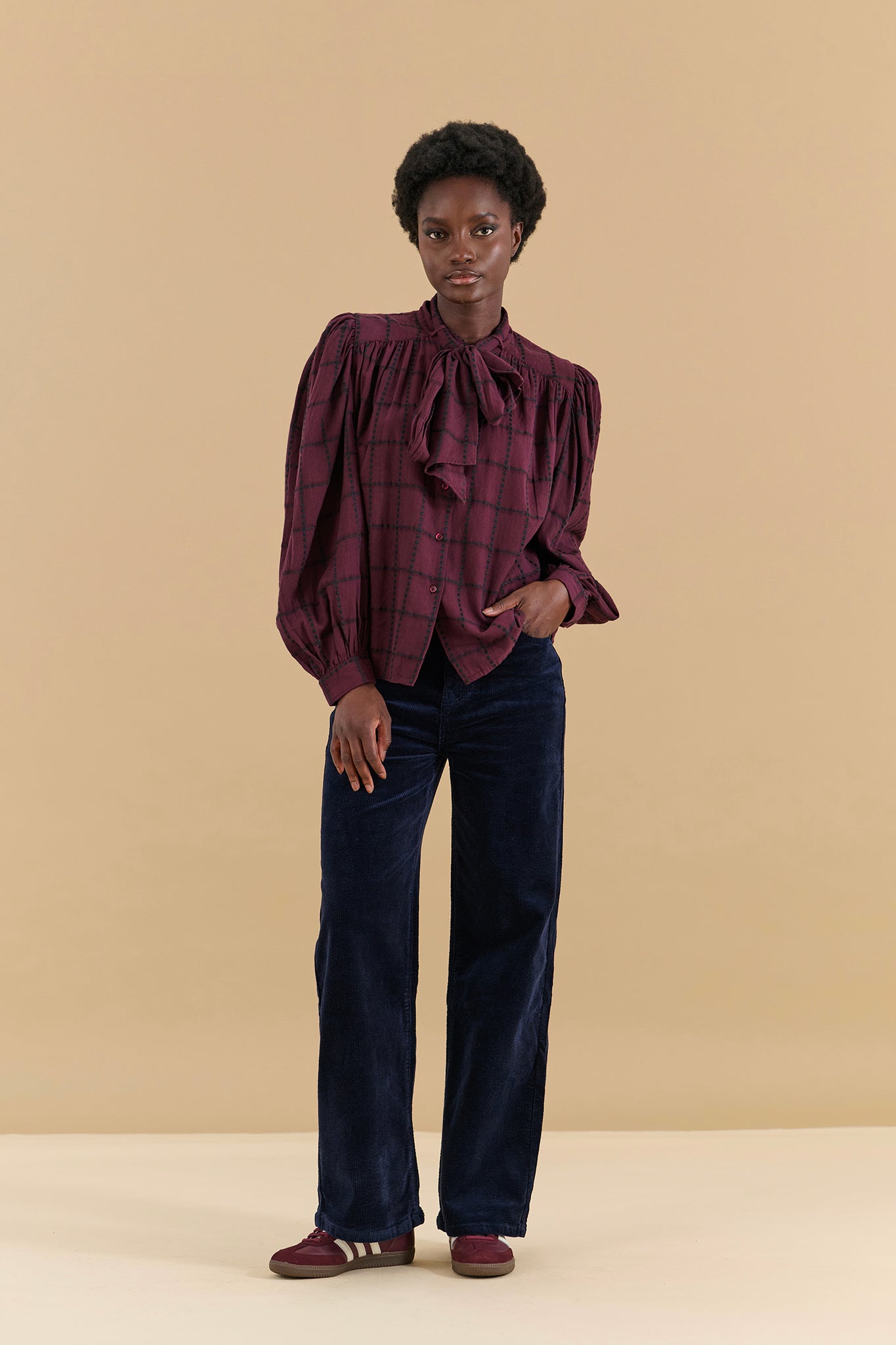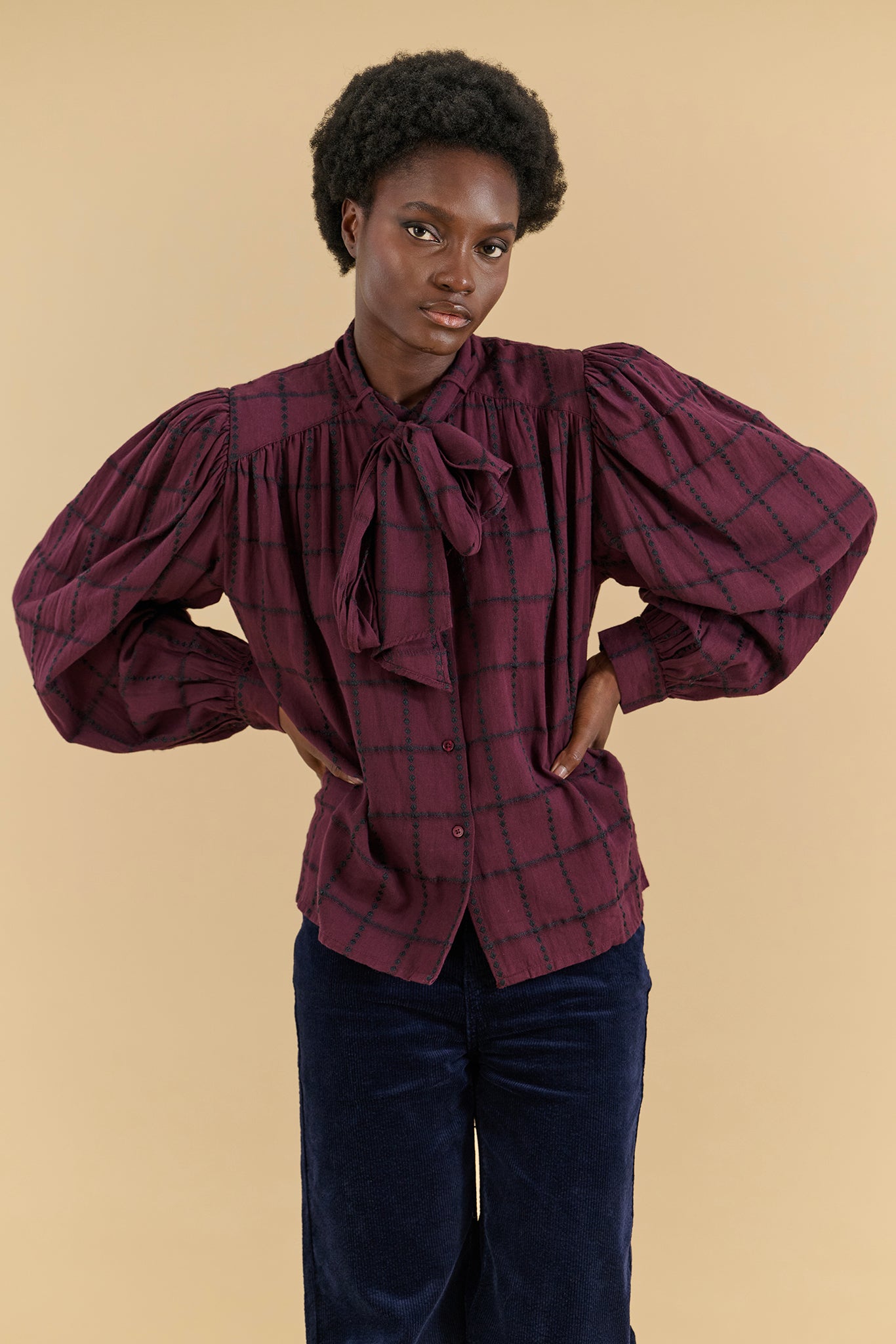 Blouse à lavalière coton prune carreaux noirs
